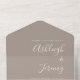 This simple modern all-in-one wedding invitation features white text on a taupe background. Add the names of the bride and groom in stylish handwriting calligraphy and the details in sans serif font. The detachable RSVP features taupe text on a white background. Add your return address in white on the taupe exterior flap and back of the RSVP.