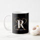 This elegant stylish custom monogram mug features a gold script initial monogram with a bold white initial superimposed, and the name underneath, on a black background. This monogrammed mug makes a great gift for all occasions.