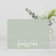 A chic personalised stationery flat note card featuring your name in a white brush script with decorative swashes on a sage green background. Modern simple elegance.