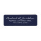 This return address label features bride and groom's name in white modern script font with address in white modern sans serif font on navy blue background.