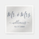 Elegant personalised navy blue and silver Mr. and Mrs. wedding paper napkins with modern script. Easily personalise online. Matching items available to complement these modern navy blue and silver wedding napkins.