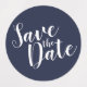 featuring title "Save the Date" in white modern script font on navy blue background.