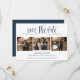 Elegant navy blue wedding 3 photo save the date cards with modern calligraphy. Easily personalise this card with your images and wedding details including a wedding website.
