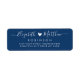 Modern, Elegant Navy Blue and White Hand Lettered Wedding Return Address Labels. Featuring a beautiful hand-written script bride and groom's first name template with swash-tail font and little heart shape between the names. Easy to personalise them with your names and return address info.