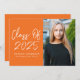 Celebrate your graduate’s achievement with these modern graduation party invitations featuring “Class of 2025” in an elegant white handwritten script on a bold orange background. Customize the front with the graduate’s name, school name, and a vertical senior photo for a personal touch. The back of the invitation highlights all the important party details in crisp white lettering against the vibrant orange backdrop. Perfect for high school or college graduates, these stylish and contemporary invites set the tone for a memorable celebration with family and friends.