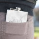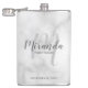 This flask features personalised bridesmaid's name in grey modern script font style and monogram in light grey modern script font style as background with title and wedding date in grey modern sans serif font style on white marble background.