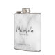 This flask features personalised bridesmaid's name in grey modern script font style with title and wedding date in grey modern sans serif font style on white marble background.