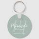 This keychain features personalised bridesmaid's name in white modern script font style and monogram in sage green modern script font style as background with title and wedding date in white modern sans serif font style on sage green background.