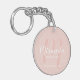 This keychain features personalised bridesmaid's name in white modern script font style and monogram in blush pink modern script font style as background with title and wedding date in white modern sans serif font style on blush pink background.
