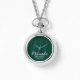 This design features personalised bridesmaid's name in white modern script font style and monogram in light emerald green modern script font style as background with title and wedding date in white modern sans serif font style on emerald green background.