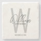 This design features personalised groomsman's name in grey modern handwriting script font style and monogram in light grey modern sans serif font style as background, with wedding details in grey modern sans serif font style, on marble coaster.