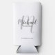 This can cooler features personalised groomsmen's name in grey modern script font style and monogram in light grey modern script font style as background with title and wedding date in grey modern sans serif font style on white background.