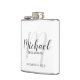 This flask features personalised groomsmen's name in grey modern script font style and monogram in light grey modern script font style as background with title and wedding date in grey modern sans serif font style.