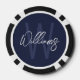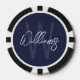 This design features personalised name in white modern handwriting script font style and monogram in light navy blue modern sans serif font style as background, on navy blue background.