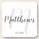 featuring family name in grey modern script font style and monogram in light grey modern script font style as background