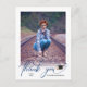 This simple photo graduation thank you postcard features dark blue modern script "thank you" that appears below the vertical photo. The backside offer custom text for a personal thank you message.