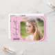 This modern script graduation party invitation features handwriting style text and a square photo with rounded corners on a light pink background. The backside offers a second vertical photo and custom text for you to add your party invitation details.