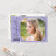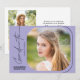 This modern script graduation party invitation features handwriting style text and a square photo with rounded corners on a light purple background. The backside offers a second vertical photo and custom text for you to add your party invitation details.