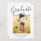This modern graduation invitation is a stylish way to announce your exciting news. The front of the graduation announcement features calligraphy lettering that reads "Graduate" above a large photo of the graduate. Add the graduate's name, school, and graduation year below the photo. On the back of the graduation party invitation, easily add your party details in the provided template.