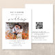 Modern Script Photo Wedding. Add your favourite photo and personalise with your details. Wedding is in a stylish set handwritten style script. Generate a QR code to your wedding website to replace the one on the reverse simply by replacing the sample URL with your own, for a convenient way for your guests to rsvp and see more details.