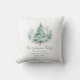 Personalized family Christmas pillow features watercolor pine tree and elegant script family name in sage green, modern and simple.