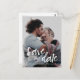 Personalise this classic and chic Save the Date photo postcard design with your own vertical engagement photo, names, wedding date and location. Modern script typography for the words "Save the date"