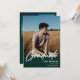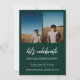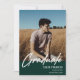 Modern white script "Graduate" overlay, senior class photo graduation announcement and invitation in green. Template lines for graduate's name, class of year and school. Back of card features 2 additional photo spaces with text lines for your open house/graduation party details.