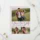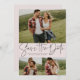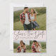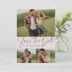 With a three photos and a modern script written "save the date" in slate grey on a blush pink background, this card is the perfect way to announce your engagement and upcoming wedding to friends and family. The white text is bold and modern but still sophisticated. The customisable text on the front has room for names, date, location and other information like a wedding website. The back is a matching pink with a white starry speckle. The colour can be changed by clicking "customise further."