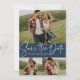 With a three photos and a modern script written "save the date" in white on a navy blue background, this card is the perfect way to announce your engagement and upcoming wedding to friends and family. The white text is bold and modern but still sophisticated. The customisable text on the front has room for names, date, location and other information like a wedding website. The back is a matching navy with a white starry speckle. The colour can be changed by clicking "customise further."