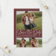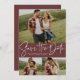 With a three photos and a modern script written "save the date" in white on a brick red background, this card is the perfect way to announce your engagement and upcoming wedding to friends and family. The white text is bold and modern but still sophisticated. The customisable text on the front has room for names, date, location and other information like a wedding website. The back is a matching mauve with a white starry speckle. The colour can be changed by clicking "customise further."