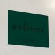 featuring title "Welcome" in real gold foil modern script font with details in real gold gold modern sans serif font on emerald green background.