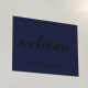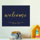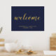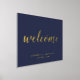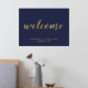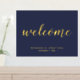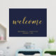 featuring title "Welcome" in real gold foil modern script font with details in real gold gold modern sans serif font on navy blue background.