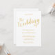 featuring title in gold modern script font with wedding details in gold modern sans serif font on white background.