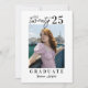This black and white coloured modern minimal graduation party invitation features both script and sans serif typography. This pairing of flowing script and modern sans serif creates a stylish balance, with the script adding sophistication and the sans serif ensuring clarity and readability. Upload your favourite photo.