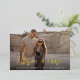 A modern save the date card designed to accommodate your favourite horizontal or landscape orientated full-bleed engagement photo. Your names appear near the bottom of your photo in gold foil handwritten script lettering, with your wedding date and wedding location beneath. Personalise the back with additional details, such as your wedding website.