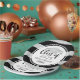 Custom graduation paper plates feature the class year and graduate's name in a stylish and elegant black calligraphy script with silver grey coloured grad cap and bold stripe patterned background. Scroll accent design.