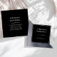 Modern, trendy design features simple white lettering in a black square, against a dramatic background of white marble and silver faux brushed metal foil. Add your contact information on the reverse in white sans serif font on a solid black background.