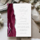 The left-hand edge of this elegant modern wedding invitation features a burgundy red watercolor agate border trimmed with faux silver glitter. The customisable text combines handwriting, copperplate and italic fonts in real silver foil on a white background. The reverse side features a matching burgundy and silver agate design.