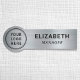 Modern name tag with your business or organisation's company logo against a silver faux metallic background. Add a name and title in simple typography.