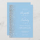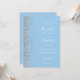 The left-hand edge of this elegant modern wedding invitation features a silver faux glitter design. The customisable text combines white handwriting, copperplate and italic fonts on a baby blue background. The reverse side provides space for wedding details on a solid baby blue background, along with a QR code guests can scan to visit your website and RSVP, which saves the cost of printing and mailing separate RSVP cards.