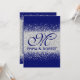 An elegant invitation featuring silver glitter confetti dispersing into a deep royal blue background. The back of the card contains your text within a large black rectangle surrounded by a silver glitter frame. You can fully personalise it by going to the customise menu. This is part of a beautiful matching wedding suite.