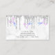 Elegant and pretty hairstylist business card featuring faux silver glitter, holographic scissors, white marble texture and elegant calligraphy font.
