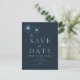 Modern simple daisy elegant navy blue wedding save the date invitation. Three Cool retro minimalist daisies with in dusty blue line art with elegant typography script on a dark navy blue background. This minimalistic floral blue save the date card is easy to personalise using the simple templates. Ideal for setting the tone for a stylish chic winter summer spring or autumn wedding. Original artwork by artist Catherine Sweetman