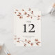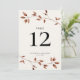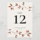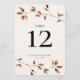 These simple minimal autumn wedding table large size number cards feature a sprig of fall leaves at the top, with a light beige background.