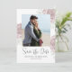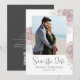 This beautiful design features save a date wedding QR code with the online website for more information, a save-the-date photo simple, with dusty rose floral greenery foliage, a 1 photo picture layout template, a modern elegant couple engaged picture, a wedding botanical flower leaves, engagement photos budget postcard, with trendy calligraphy brush script, a chic minimalist whimsical stylish typography, modern brush calligraphy script, simple save the date with elegant floral roses template