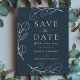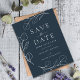Modern simple eucalyptus leaves navy blue and white unique artist created custom wedding save the date budget invitation to remind friends and family to keep the date free. Beautiful minimalist foliage with stylish simplistic greenery line art drawing complemented with white elegant typography script on a black background. A minimalistic stylish botanical design that is easy to personalise using the easy to use template. Original artwork by artist Catherine Sweetman