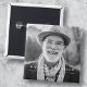 Design in simple sans serif typography. Add year of birth and death and a custom photo.
