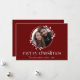 This burgundy red and white photo Christmas card features a round photo surrounded by a simple hand drawn white wreath. It's paired with modern text. Enter your family name on the front and your first names and year under the back message.