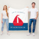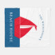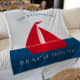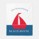 Stunning nautical red white and blue fleece blanket featuring a red boat on a white and blue colorblock background , with a two text templates where you can add your family name and boat house , summer home or even cottage , very easy to personalise and make it your own.