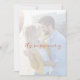 This simple, unique, and modern wedding save the date features trendy rose gold copper hand lettered script and the text "It's Happening" on the front with your own photo with a transparent overlay. Design by T.K. Goforth.